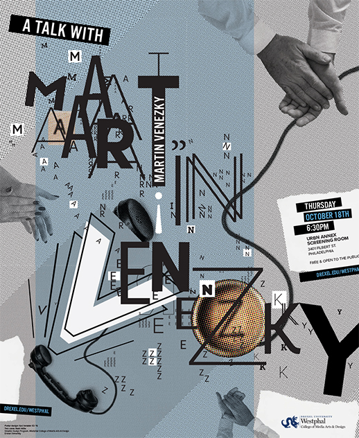 On October 18, the Graphic Design program at Drexel University will host renowned designer Martin Venezky in the URBN Annex Screening Room. Venezky is the mastermind and master designer behind Appetite Engineers, an internationally recognized, San Francisco-based design firm founded in 1997. Also known for his illustrations for the New York Times and Wired, and his installations at the Silicon Valley Facebook and Adobe campuses, Venezky has maintained a long-standing interest in process and abstraction, which have held prominence in his graphic design work.